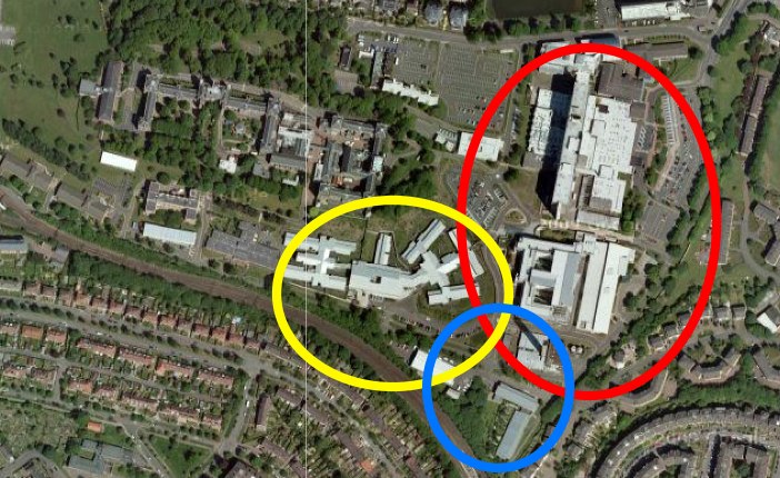 The red circle is around Gartnavel General, the physical disease hospital, the yellow is around Gartnavel Royal, the psychiatric disease hospital, and the blue is around the Centre for Integrative Care, the health-focused hospital.