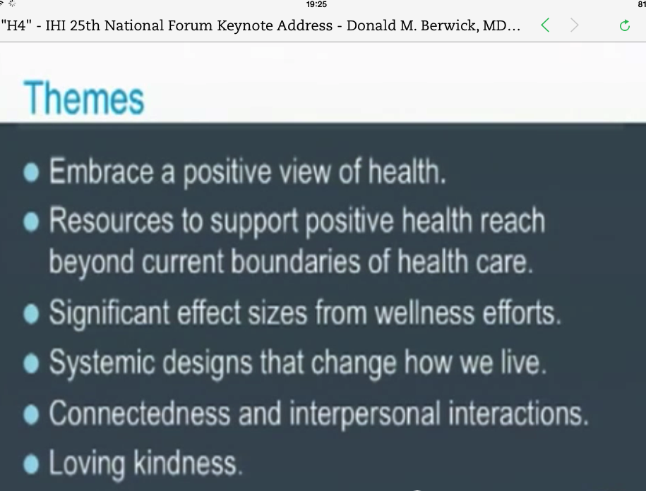 I’ve long been impressed by Don Berwick, whose “Crossing the Quality Chasm” introduced me to the concept of the Complex Adaptive System. So I was keen to listen to his keynote presentation at the Institute of Healthcare Improvement at the end of 2013. I urge you to take the time to watch this….ok, it’s 48 minutes long, but it is one of his very best talks.