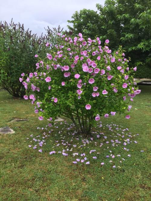 Just look how beautiful this is! Not just the bush itself but the way the fallen flowers have made a pinkish purple circular rug on the grass around it.