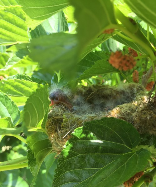 Now, embryology has always fascinated me. Probably my most favourite teacher at Medical School was the professor of anatomy who drew the stages of development of the human embryo on a giant blackboard using a pack of multicoloured chalks. Wow! How impressive was that! Sheer works of art, lecture by lecture. Sadly, we didn’t have mobile phones in those days, so none of us were able to capture those blackboard works. But I do still have them in my memory. Beautiful as they were I still remain utterly astonished that the cells of an embryo can replicate and differentiate and move into entirely the correct places to develop a human being with all the organs, tissues and networks of systems which form the new born child. When I look at this tiny chick I think the same. I think how on earth does the fertilised egg develop this head, this beak, these eyes……and now, the beginning of feathers and wings. And within two weeks from now these chicks will launch out of this nest and fly. How long does it take for a human baby to walk by him or herself? This little bird takes a month from “birth” to flying.