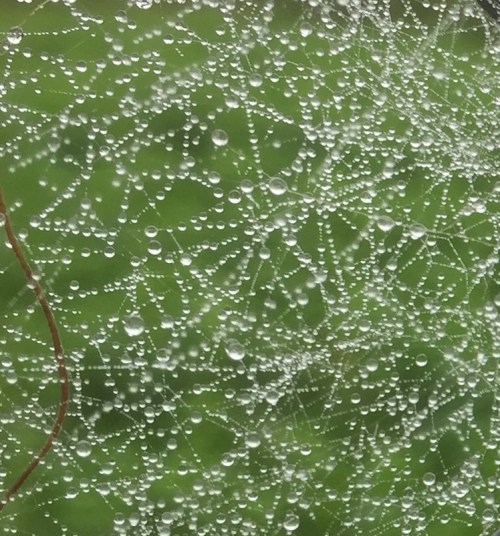 Then I noticed, directly opposite the front door, a sparkling jewel of a spider web adorned with water droplets. I find those serendipitous gifts of Nature irresistible.