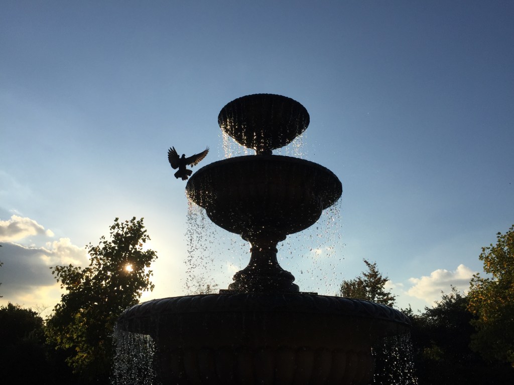 As the sun light caught the water cascading down from this fountain I crouched down and took this photo. Only later did I see the bird with its outstretched wings.