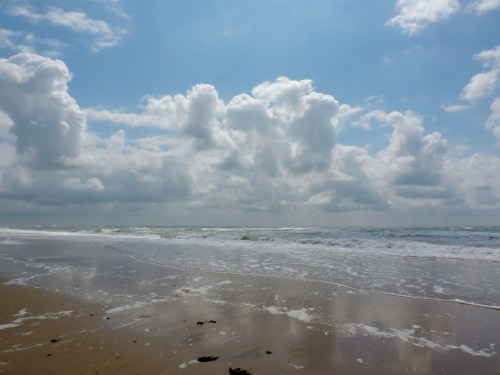 We can also see the water which has reached the beach, turning the sand into a kind of mirror because in this thin surface of water we can see the reflections of the clouds up above. I think that’s quite unusual….. it was the main thing which caught my attention and led me to take this photo. The thin layer of water on the sand has been left by breaking waves which have stretched up to a certain point on the beach, then receded back into the ocean. Some of those waves have turned to bubbles and foam. Waves don’t stand still. They are constantly on the move. They sound like the ocean breathing, breathing the water out onto the sand, and then breathing it back into itself again.
