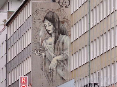 This photo is of a mural I spotted in Malmo three years ago. It’s by a South African street artist, “Faith 47”. I don’t know anything about this artist, or this particular work of art, and, probably, most people who see this haven’t read anything about it. It works as itself. It works as an image.