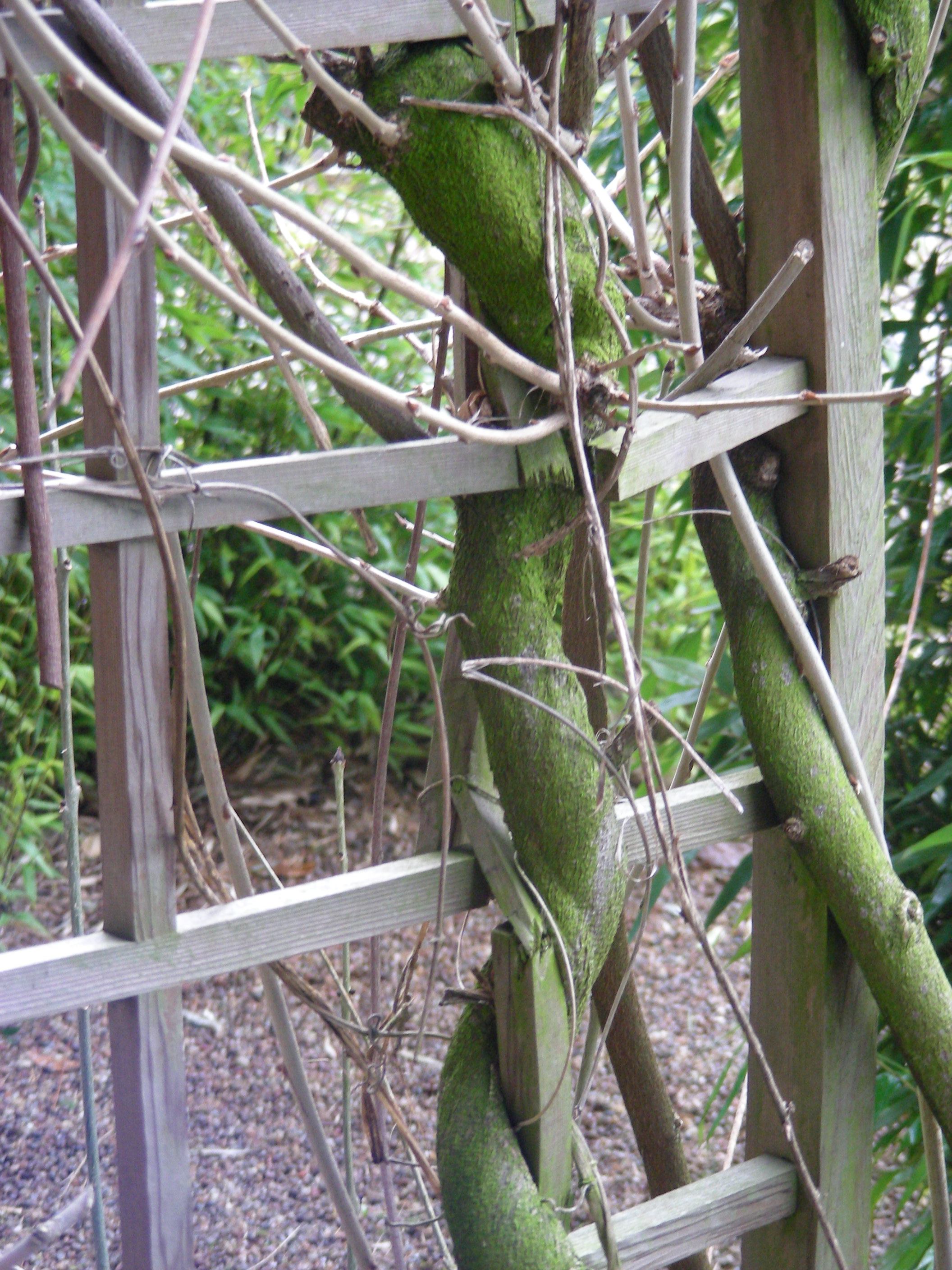 A few years after the hospital opened and the gardens were laid, I noticed what this climber had done to the woodwork of the trellis as it wound its way upwards. I was astonished. I knew that climbers had great powers to reach out, connect, hang on even, but I hadn’t imagined that these plant stalks could become both so thick and so powerful. You can see this one has actually broken the wooden straps in several places.