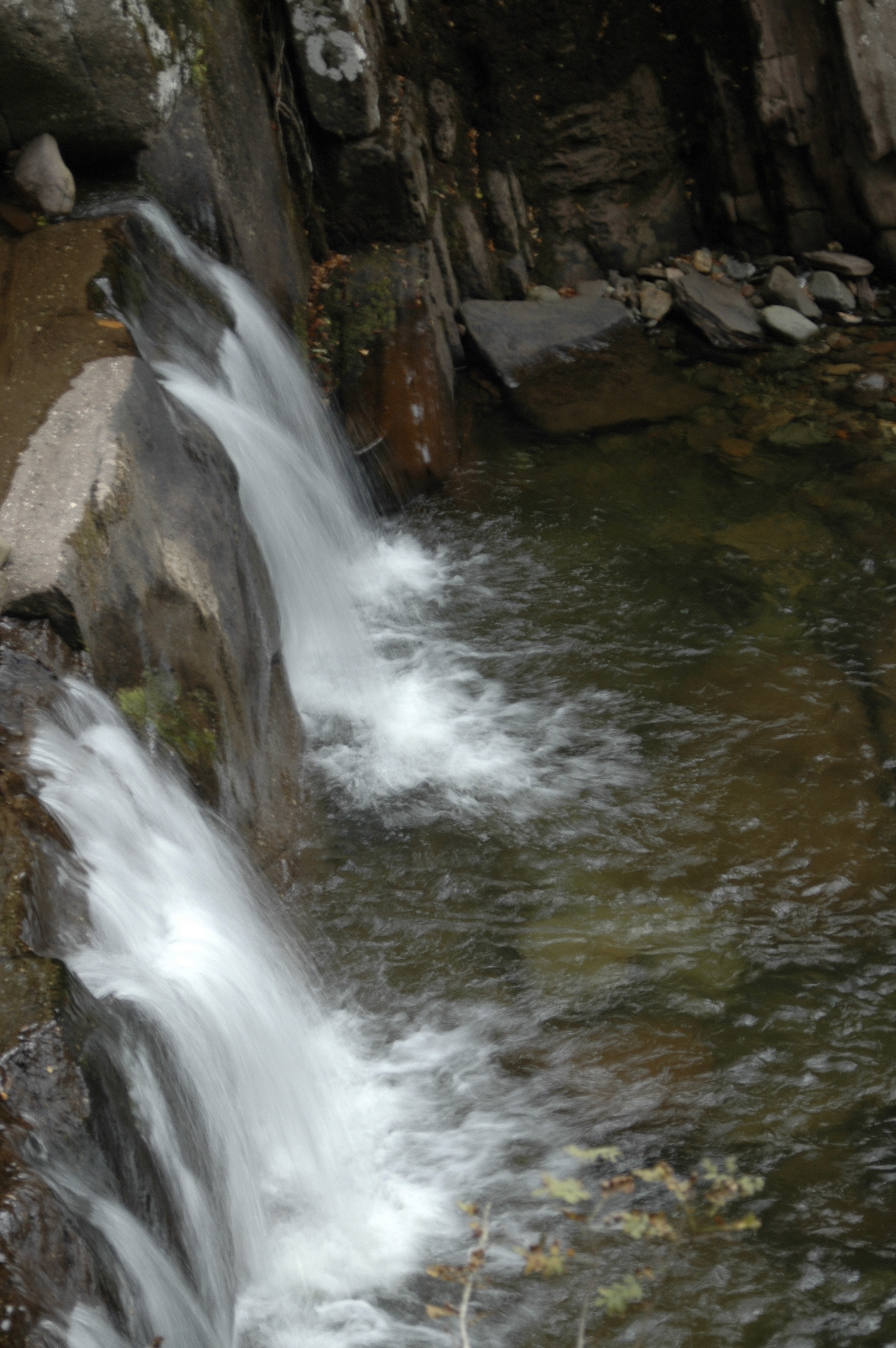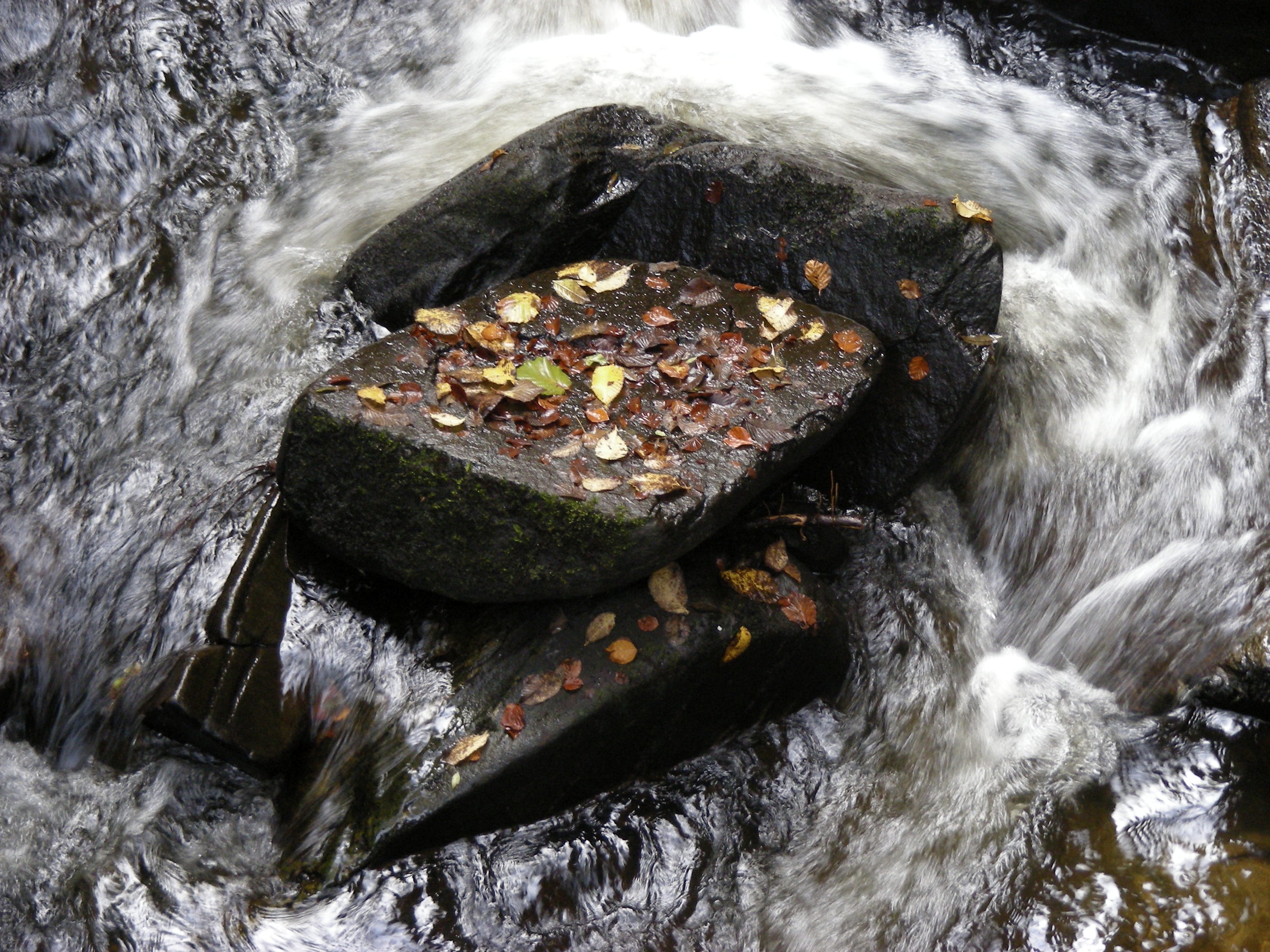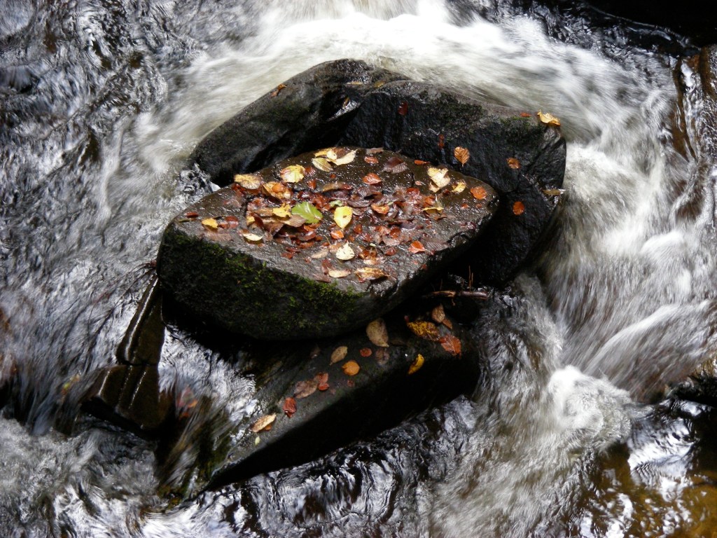 When I look at this photo the leaves seem like pieces of gold at first. Perhaps golden coins. But then I quickly see that they are fallen autumn leaves, with gold, brown, yellow and even green ones. The rock they have landed on, or stuck onto, seems like a collecting point, or a resting point. Maybe the leaves fell here from overhanging trees, but, in fact there weren’t any trees directly overhanging this rock, so maybe they were blown onto this rock. Alternatively, maybe they were swept downstream on the fast flowing water. Whatever their origin and mode of transport, they stuck to this wet rock.