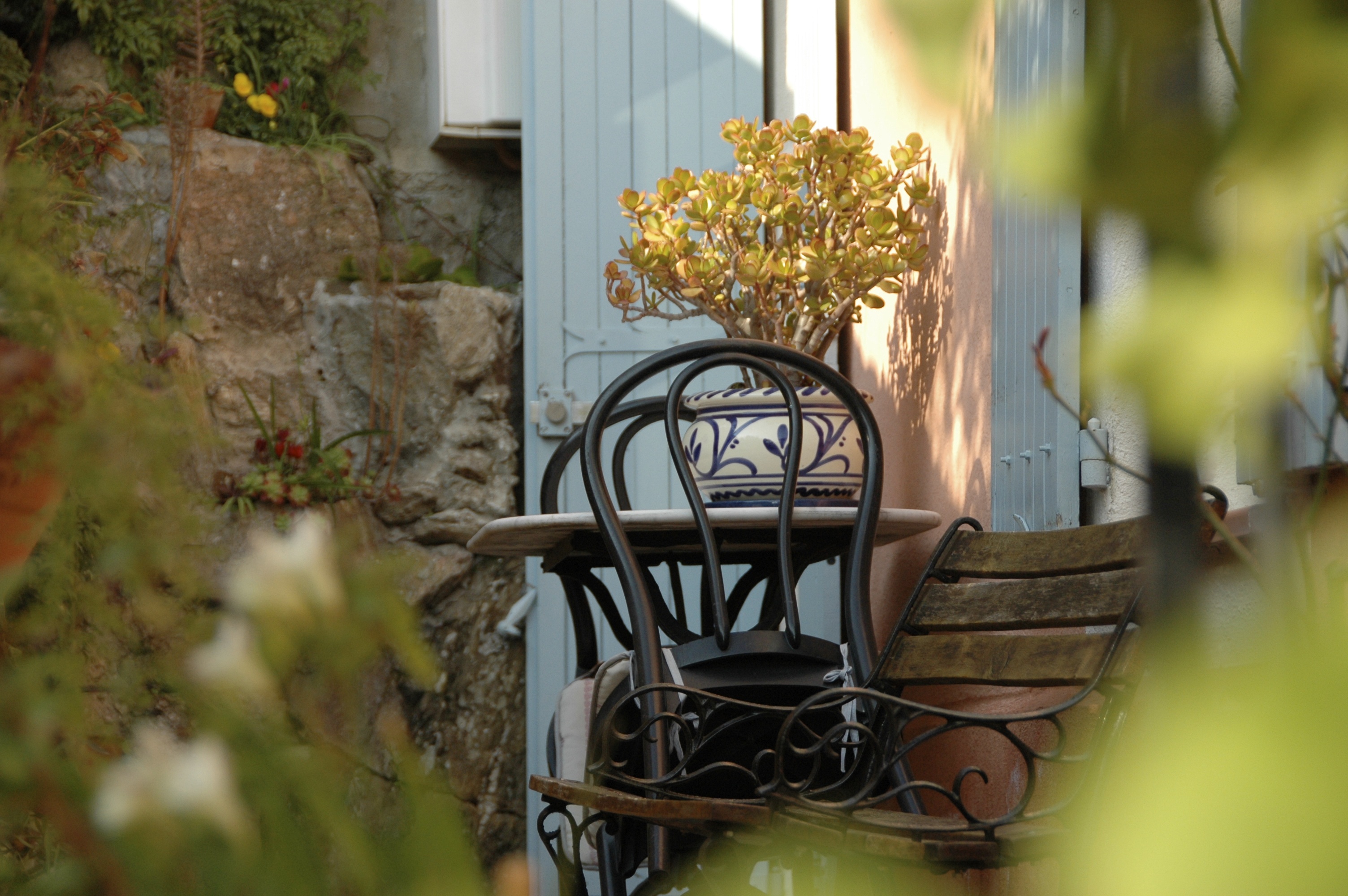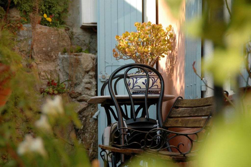 A few years ago I was walking through the Southern French town of Bormes les Mimosas and I noticed this little area just outside of a house at the end of a small pathway. It just appealed to me. As I look at it again today, I find it still appeals to me! It’s very simple. There is a small table with two chairs, a pot plant on the table and an old two seat bench just in front of it. The pale blue shutters of a window and a door are standing open and there’s an attractive, irregular, rock wall at the end of the passage. The whole scene is framed by plants giving the area a feeling of nook, hidden away in Nature.