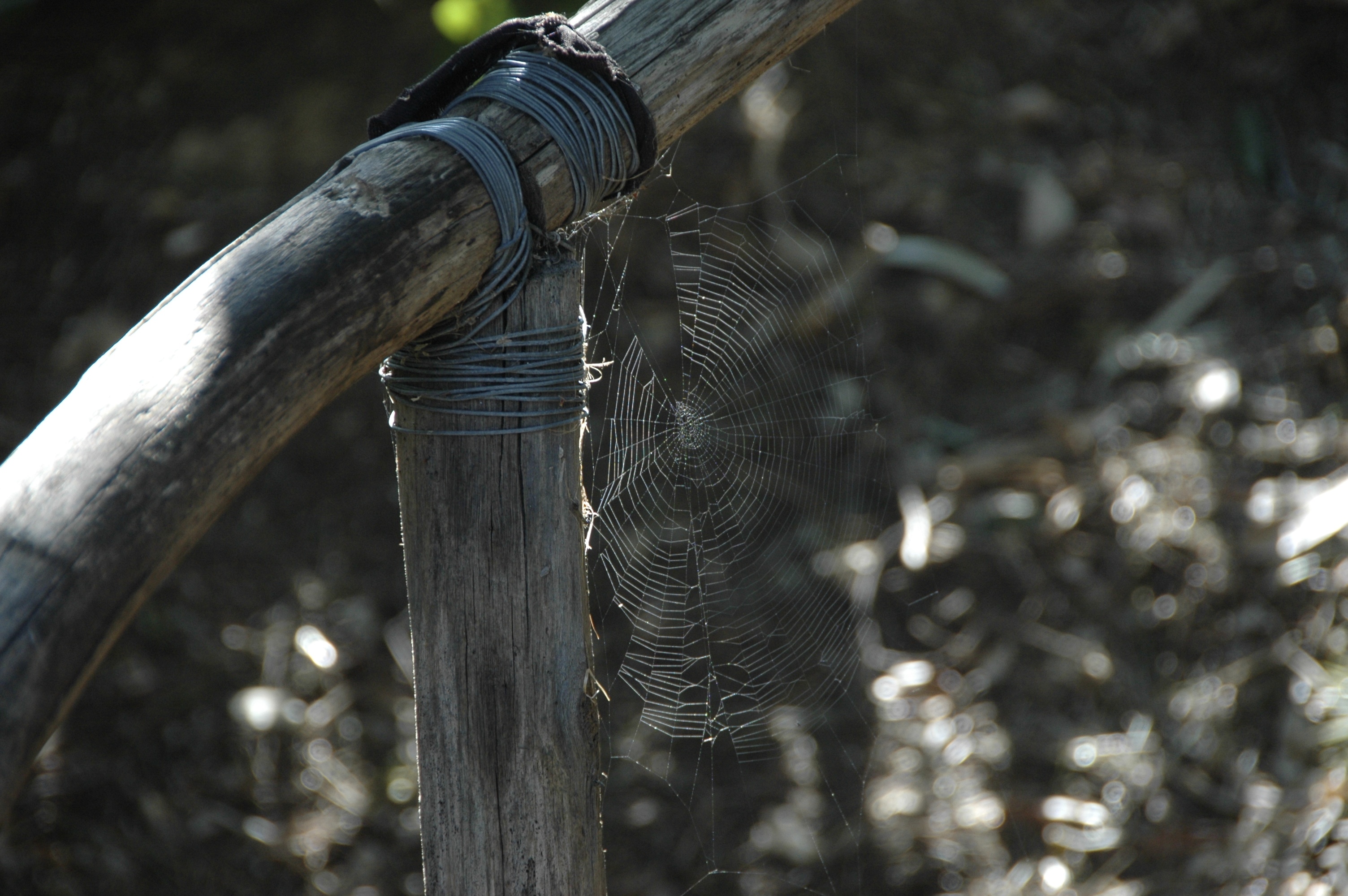 What strikes me about this photo is that I can see two completely different kinds of threads which bind. There is the wire wound round and round the wooden poles to create a fence, holding the cross posts tight to the upright. And there is the web.