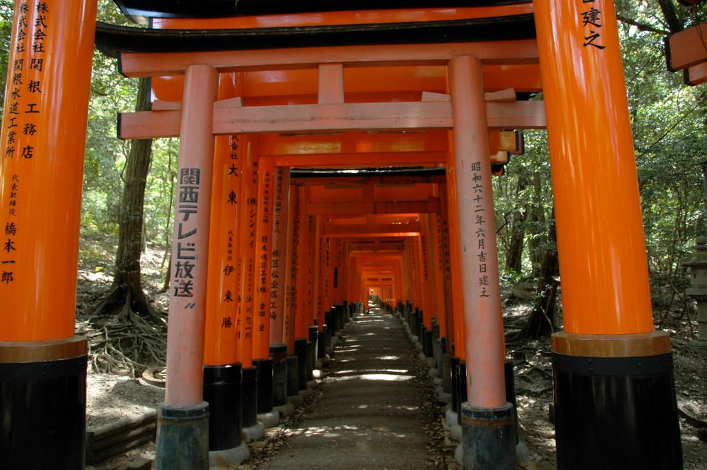 The Fushimi Inari temple just outside Kyoto is quite unlike any other place I’ve visited. It’s an experience which was unique and which remains vivid in my psyche many years later. You follow a path through a forest, up a hill until you get to the top. The path has hundreds of these “Torii” gates enclosing much of it.