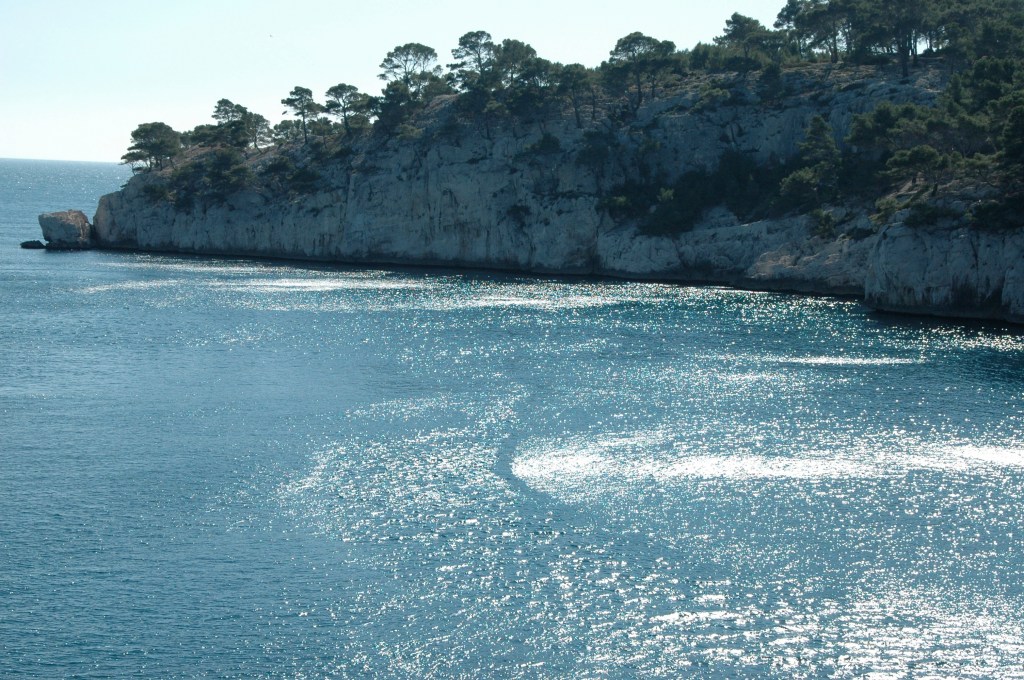 This photo has always fascinated me. At the time I took it the sunlight reflecting on the blue waters as they nestled at the foot of the wooded cliffs was what caught my attention. The whole scene is beautiful and it evokes a sense of peace and contentment in me. But from the first time I looked at it on my computer, what has struck me most has been that line on the surface of the water. Do you see it? It’s pretty much right in the middle of the image. It’s like a path, a blue path cut through the glistening white of the sunlit waters on either side of it. It is shaped like a bow, curving round from just over half way along its length to head towards the cliffs. The surface of the water in the path seems calmer than that on either side….it’s smoother somehow.