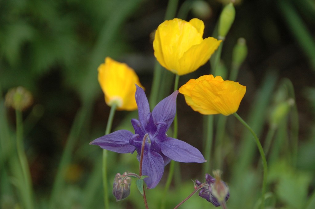 This is one of many photos I have where I get the impression that the contrasts and differences make everything in the image more beautiful. The purple against the yellow, the elaborate petal shapes against the simpler ones, both the flowers against the rich, green background. I love it.
