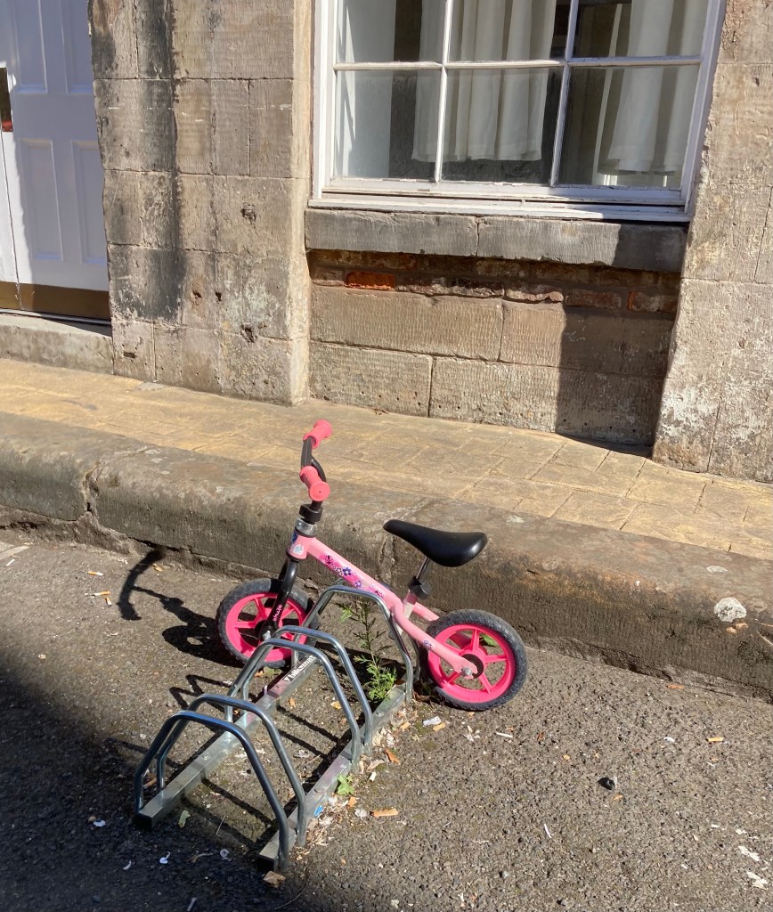 I often talk to you about l’émerveillement du quotidien or the wonder of the everyday and of course this little pink bicycle parked in the cycle rack does make me wonder about who is the child who owns this, what this says about their character and, of course about the incredible capacity of human beings to learn through copying what others do.