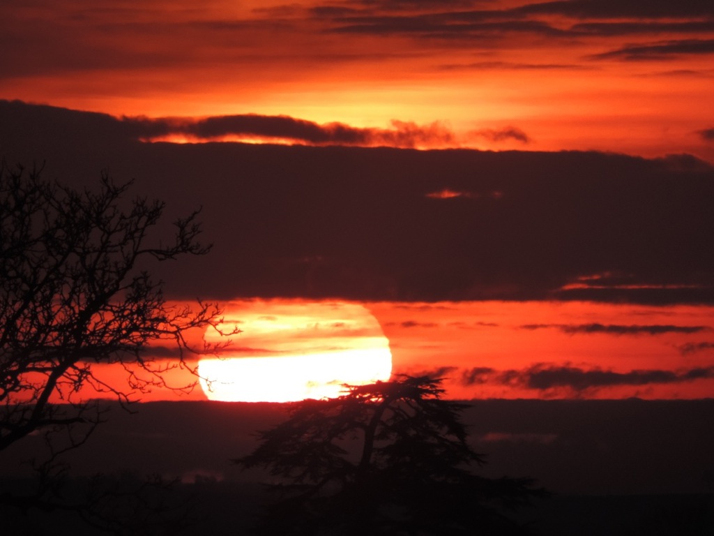 I love this photo simply for its beauty. The sun looks huge, the sky is so intensely red, and the silhouettes of the trees are like a puppet shadow play.