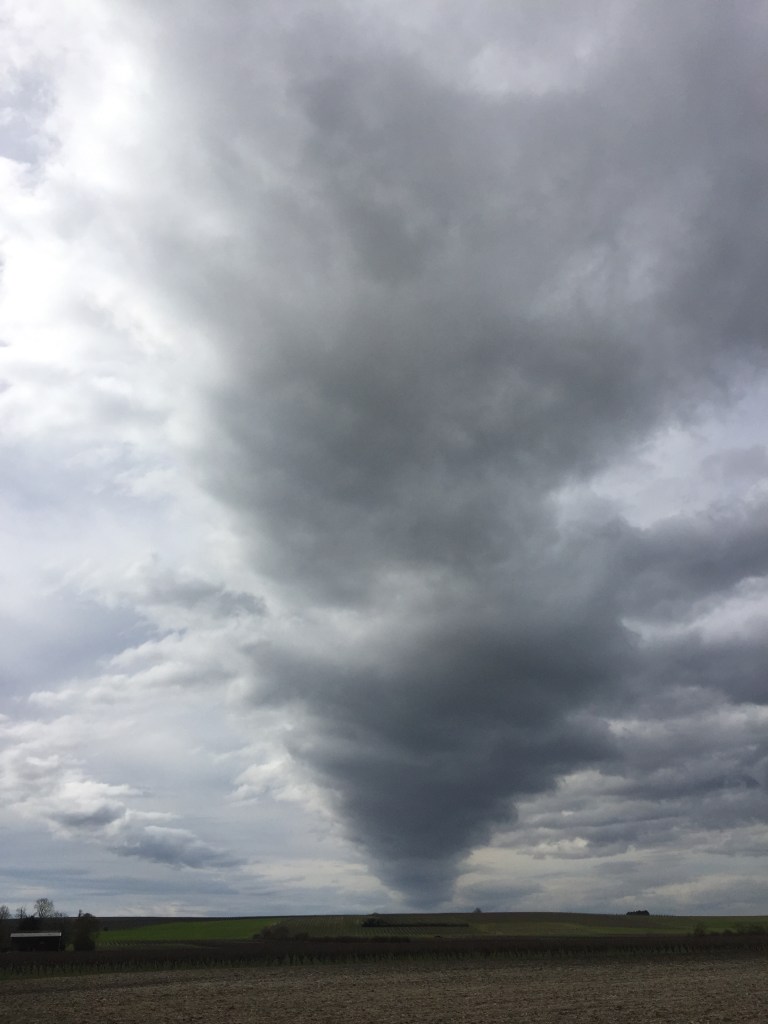 On this particular day I see a vast dark grey funnel of cloud stretching from above my head to as far as I can see. It looks like a vast highway or path in the sky. I see it as a distinct object…..a particular cloud, separate from the other clouds.