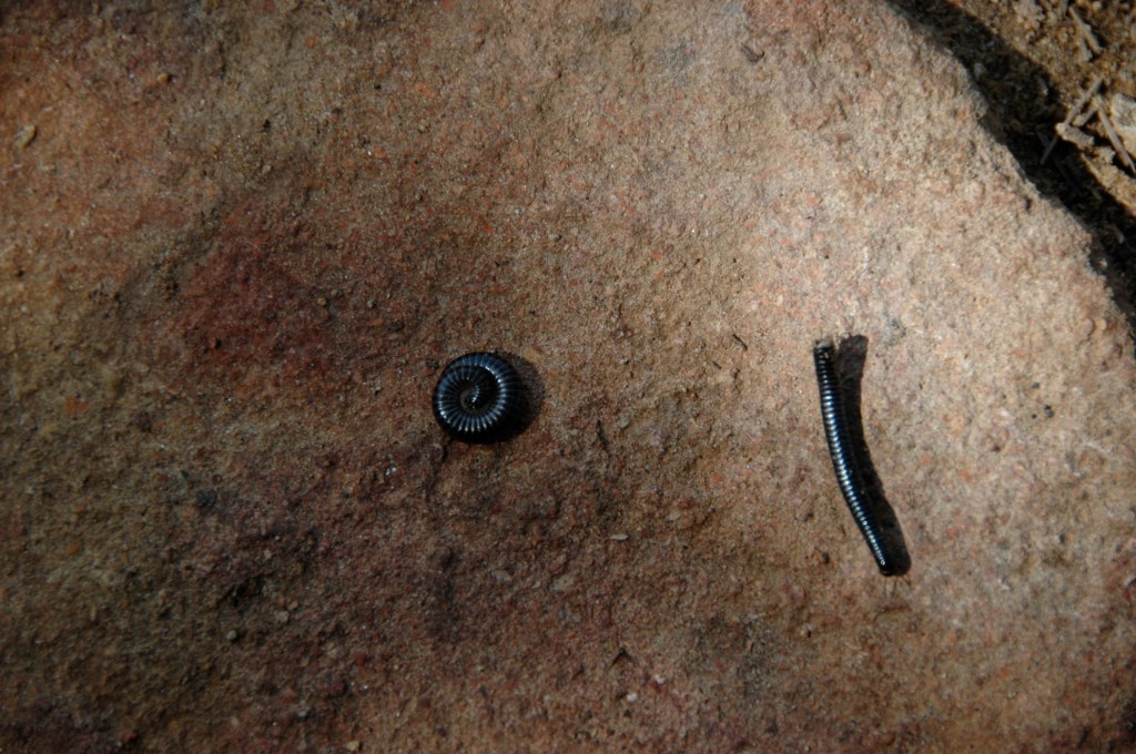 I spotted these two strange little creatures on the ground. I don’t know what they are but what struck me at the time, and what strikes me again now, is that one is curled up tightly into a little circle and the other is stretched out straight like a stick or a line.