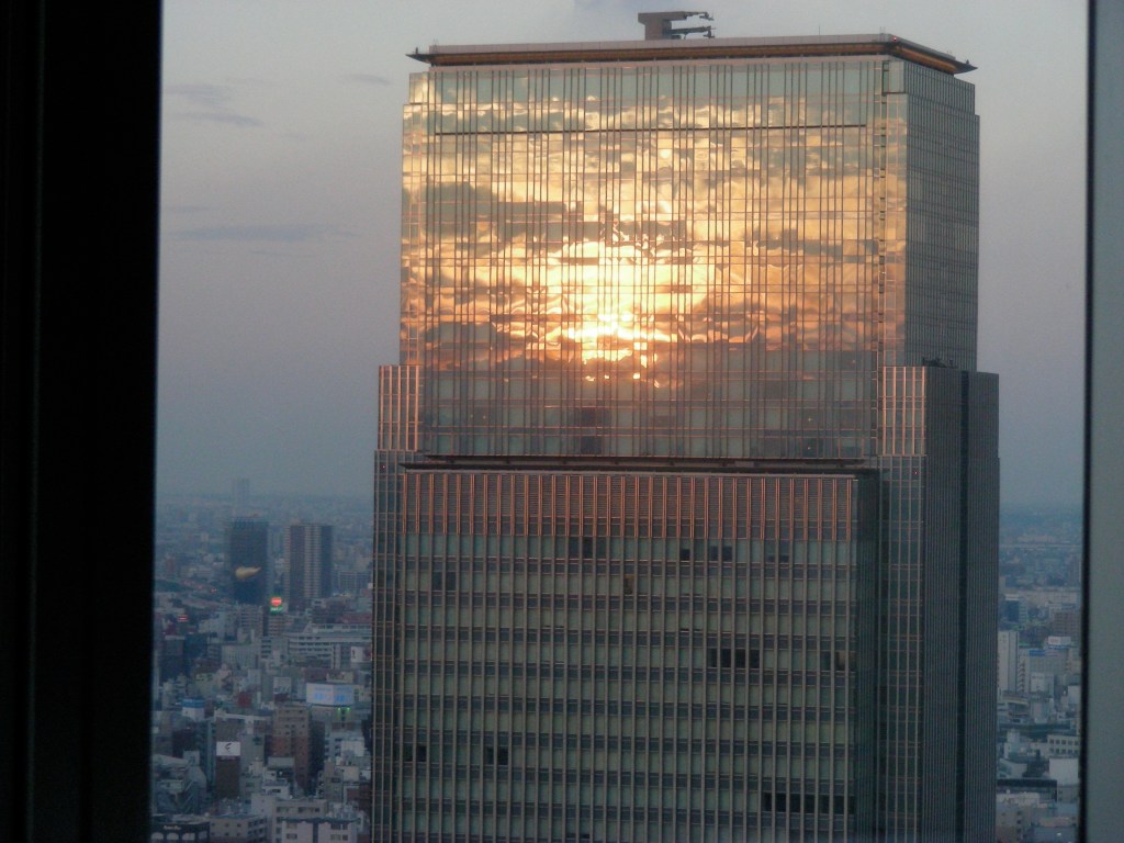 I took this photo many years ago while on a teaching trip to Tokyo. It captures the setting sun reflected in the windows of one of the many tall glass and steel skyscrapers which crowd together in the city.
