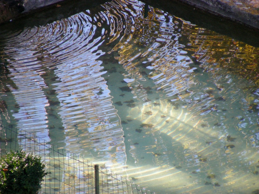 This photo takes a little bit of working out. It’s the “source”, or natural spring which lies just a few steps from our house. The water in the source is the clearest water I’ve ever seen. This is a photo of some of the leaves which have fallen into the water, the ones on the right still lying on the surface, and the rest lying on the bottom of the pond.