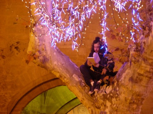 On another evening in Aix I came across this man sitting high up in a tree, reading a book. I don’t know why he picked that particular spot but I remembered him just as I was writing about the unusual places a lot of us now work from, or study in.