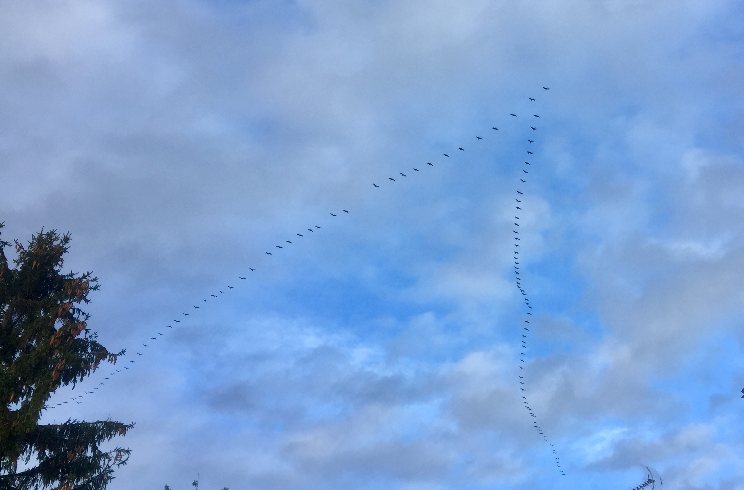 Here in Europe autumn is a season of great change where we move from summer to winter. One of the most astonishing phenomena of this season is migration. Look at this fabulous flying V of cranes heading south! I wish I could let you hear the incredible noise they make, but my little phone recording really doesn’t do them justice.