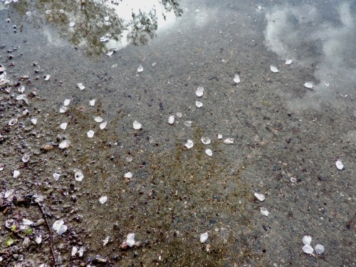 I like photos like this one. At first glance it’s a scattering of petals on the ground, but on closer inspection they are spread across both gravel and water, and when we look at the surface of the water we see more than the petals….we see the reflection of the sky, of clouds and of a tree.