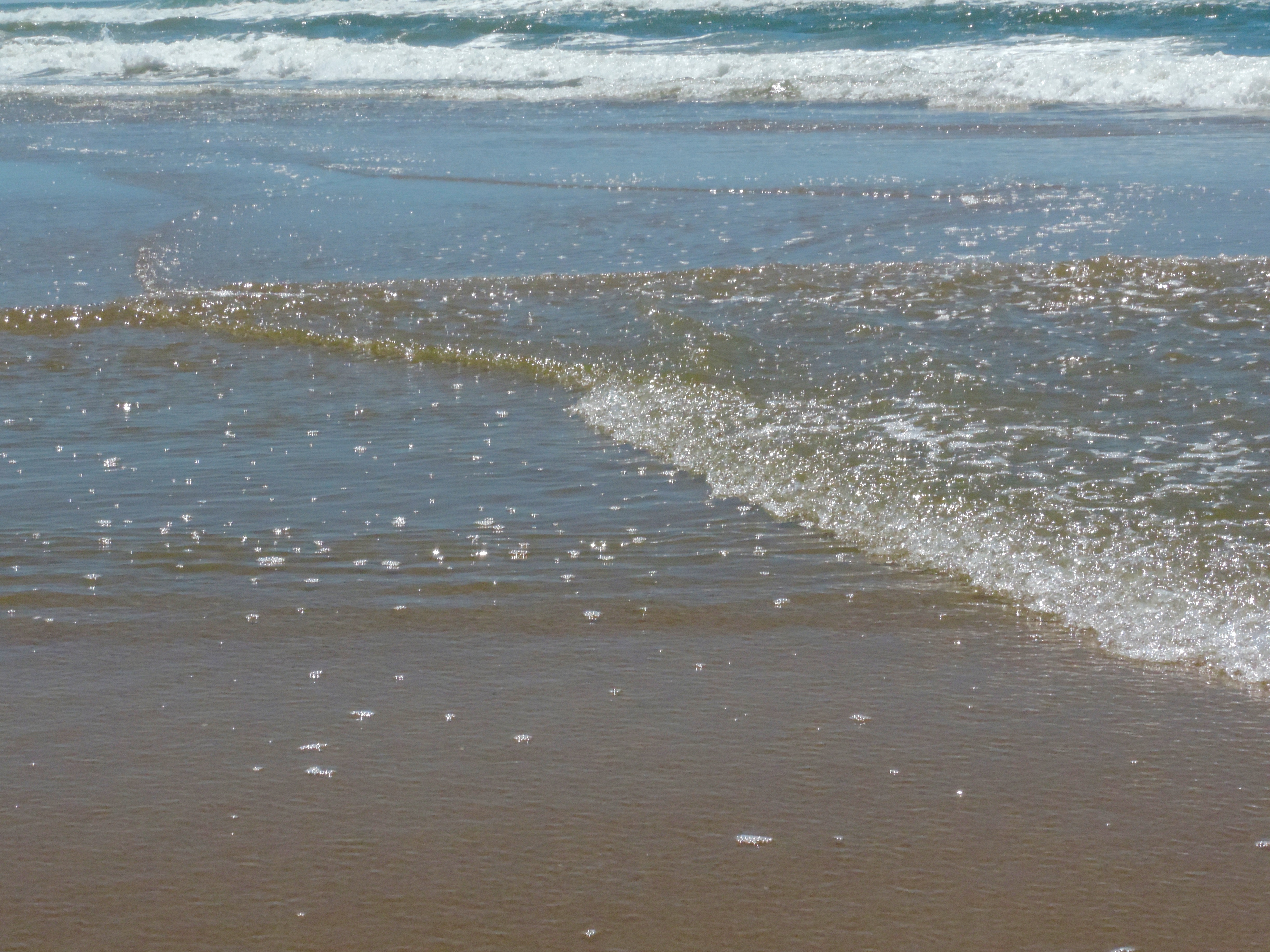 This one photo captures something of the complexity of waves at the beach. You can see at least half a dozen different “fronts” here, each one interacting with the others. It reminds me of the experiments we did in Science class at school which taught us about “interference” patterns as one wave interacts with another. I always found that both beautiful and mesmerising.
